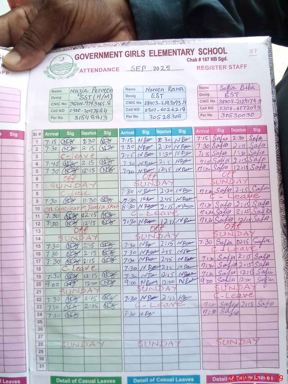 | CNIC | Full Name | Designation | R/C | Absence during last cal. month |