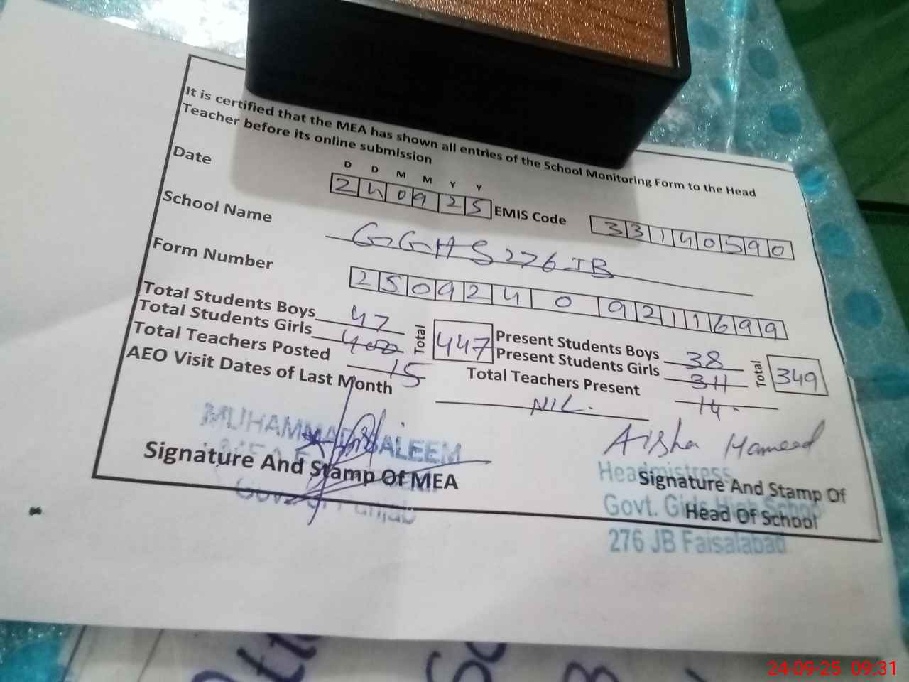 | Certified that this School was Inspected by the Undersigned MEA/DMO Today and the Information Stated Above is as Per Record. | |||||