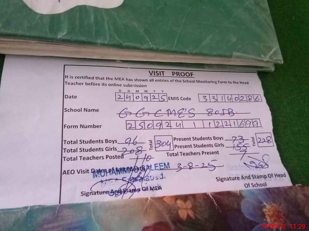 | Attendance Register | Head Teacher | MEA with School | Visit Proof |