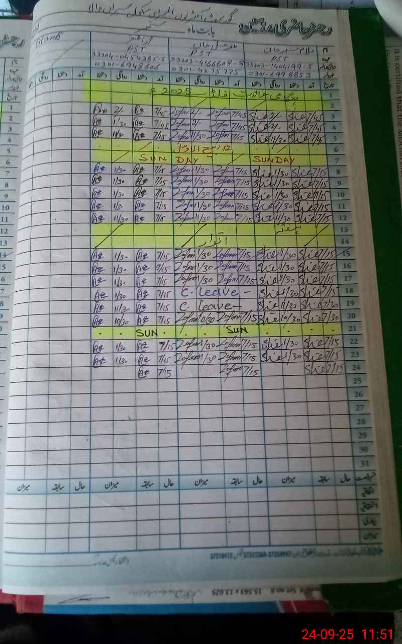 | CNIC | Full Name | Designation | R/C | Absence During Last Calender Month |