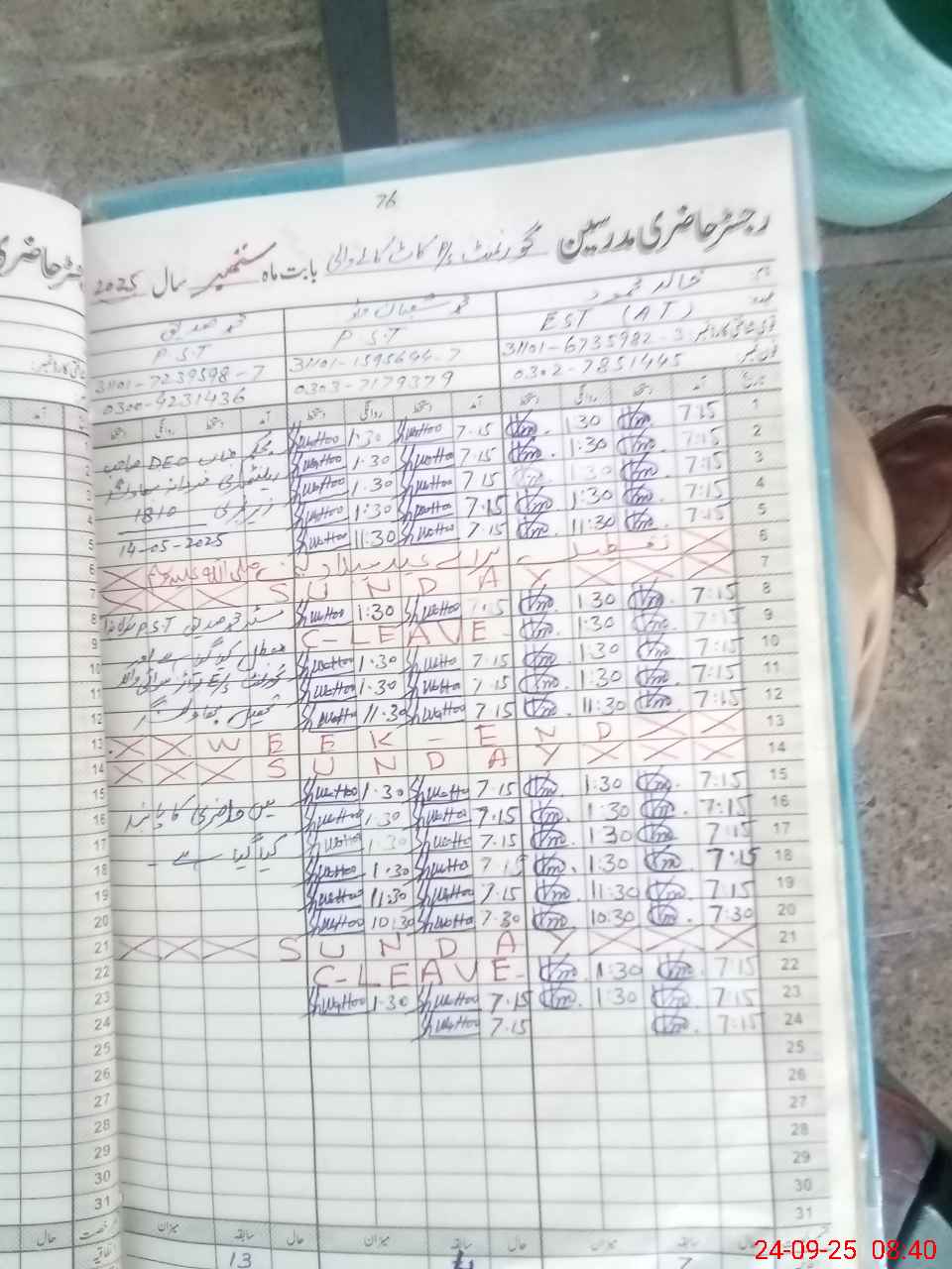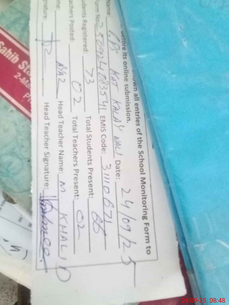 | Name: Kh**** Me**** Designation: (School Headmaster's/Headmistress's) EST Phone/Cell Number: 03**** |