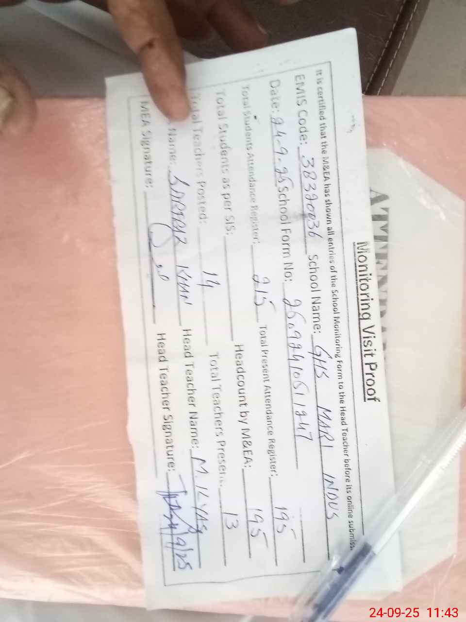 | Attendance Register | Head Teacher | MEA with School | Visit Proof |