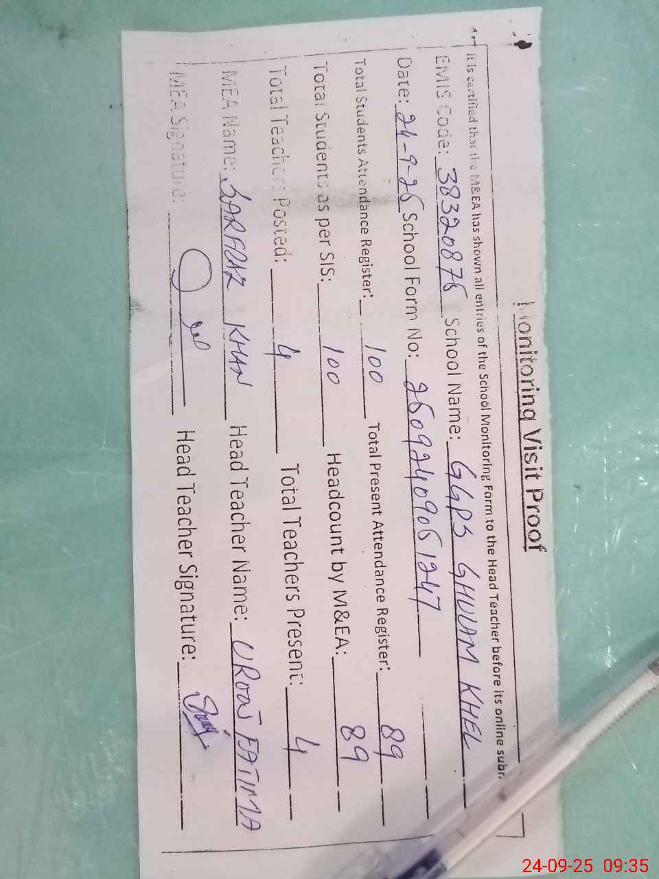| Attendance Register | Head Teacher | MEA with School | Visit Proof |