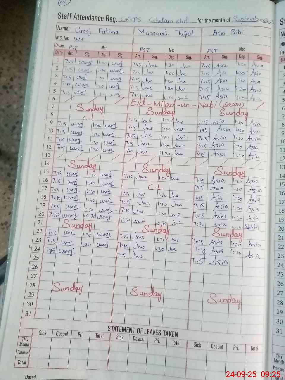 | CNIC | Full Name | Designation | R/C | Absence During Last Calender Month |