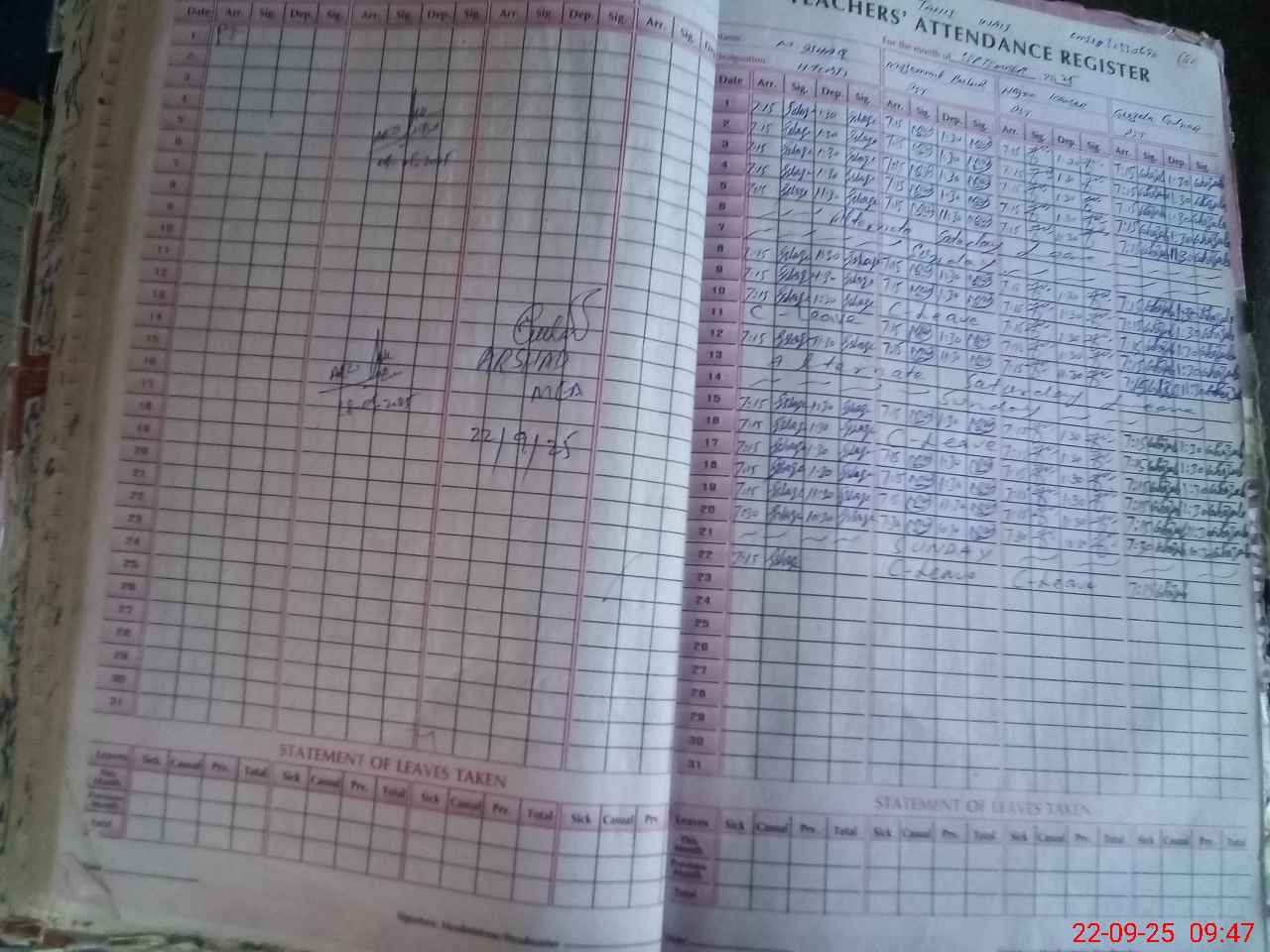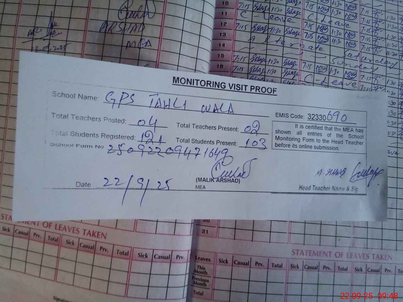 | Attendance Register | Head Teacher | MEA with School | Visit Proof |