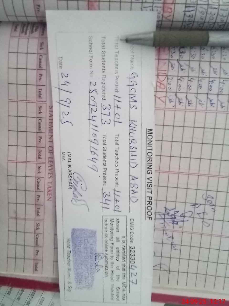 | Attendance Register | Head Teacher | MEA with School | Visit Proof |