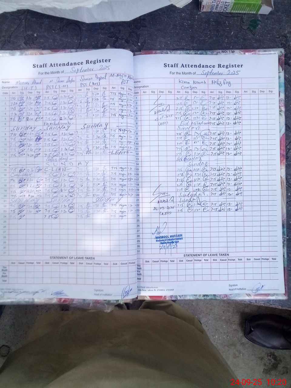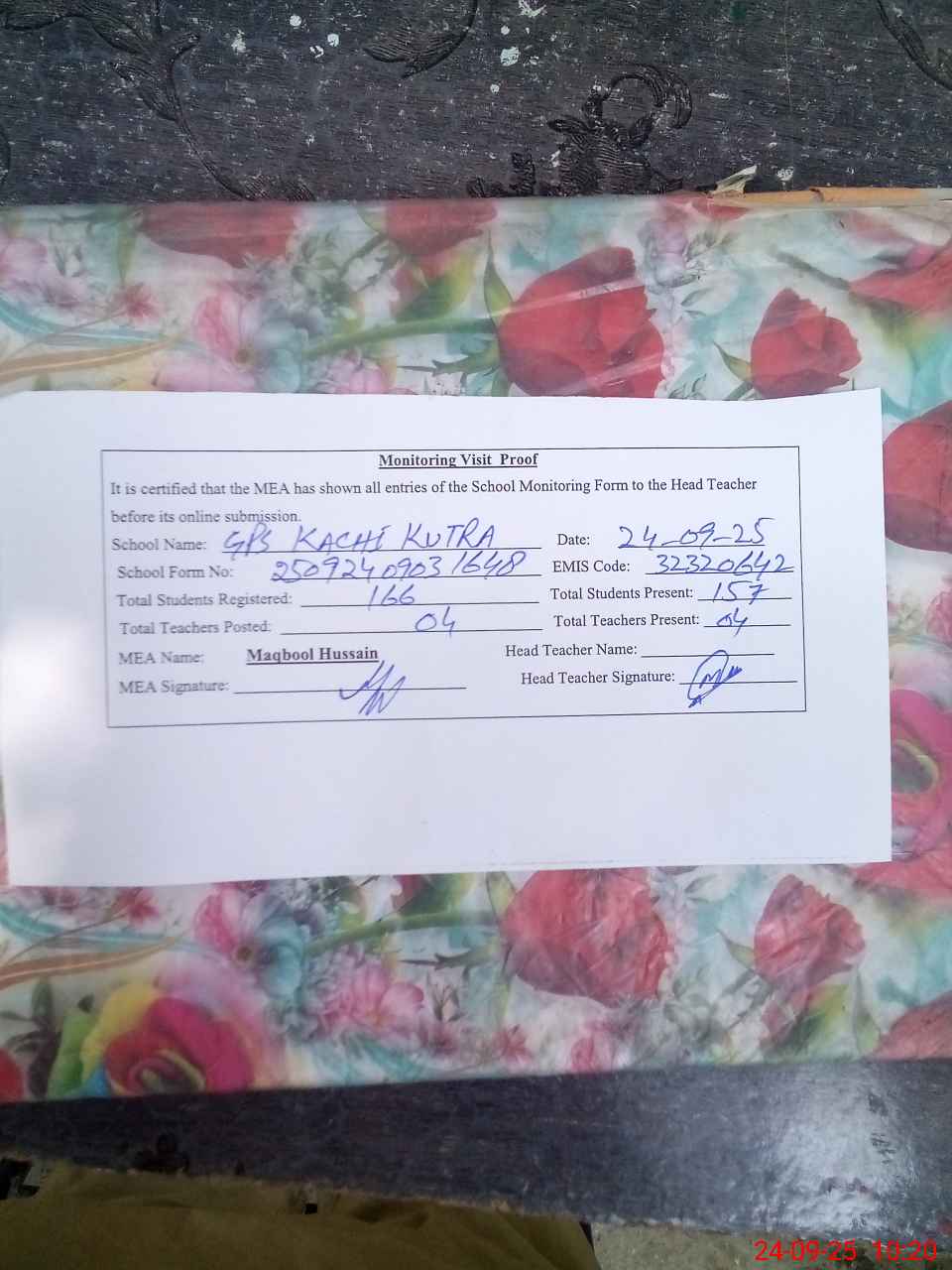 | Attendance Register | Head Teacher | MEA with School | Visit Proof |