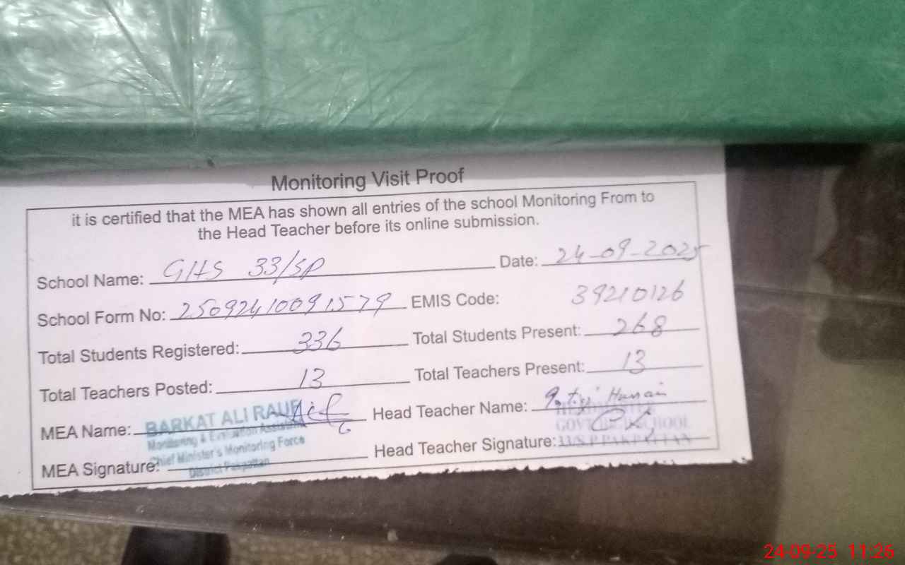 | EMIS Code: 39210126 | Name of School: GHS 33 SP | |||