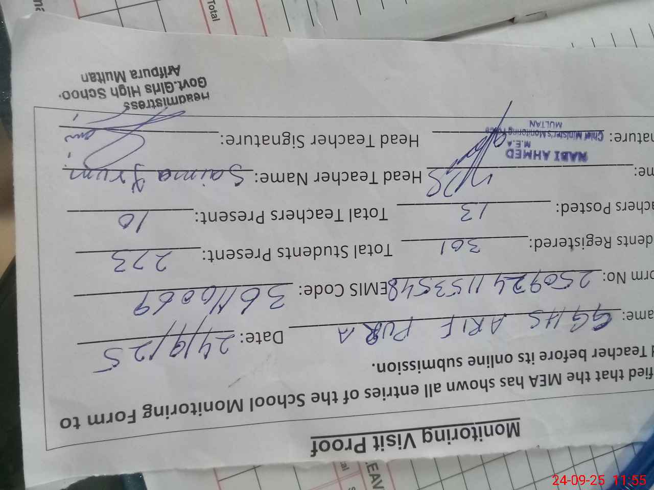 | EMIS Code: 36110069 | Name of School: GGHS ARIF PURA MULTAN | |||
