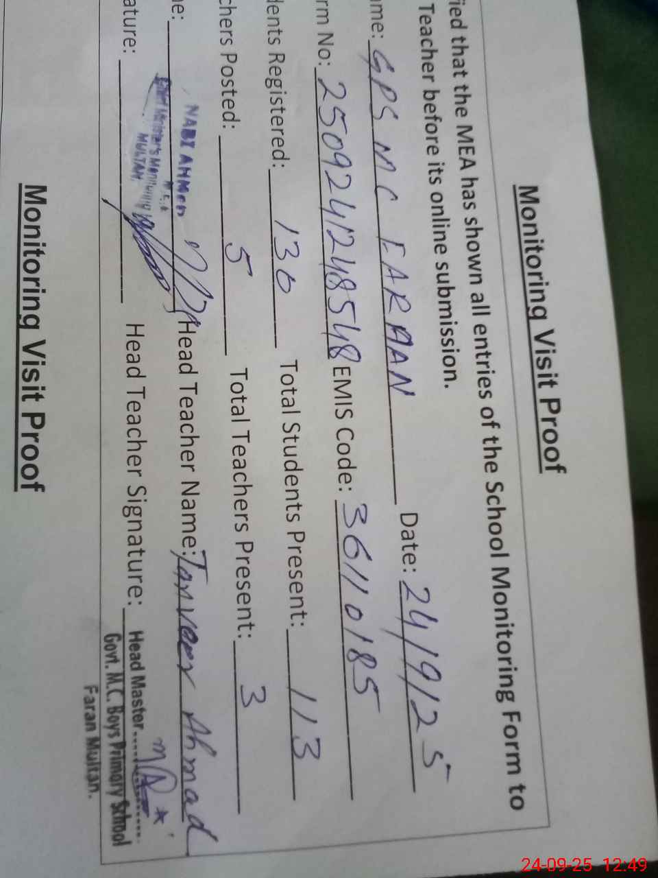 | EMIS Code: 36110185 | Name of School: GPS MC FARAAN NEAR KHONI BURJ MULTAN | |||