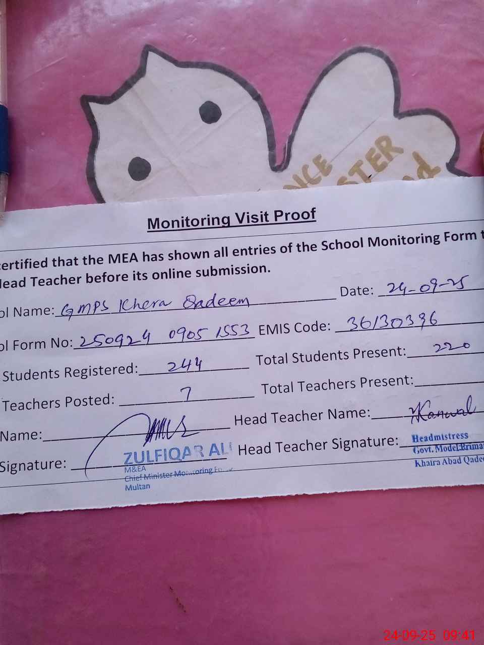 | Attendance Register | Head Teacher | MEA with School | Visit Proof |