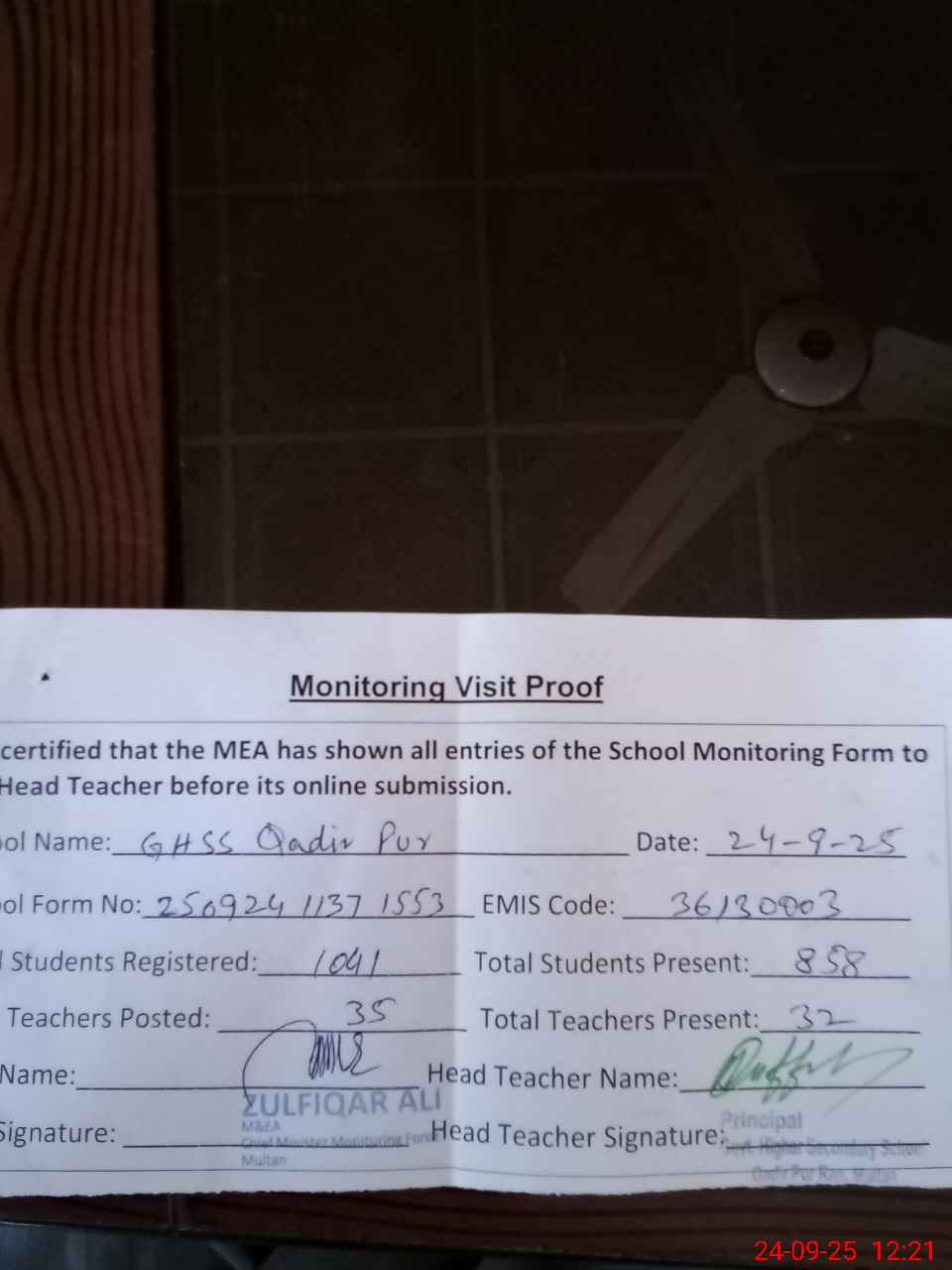 | Attendance Register | Head Teacher | MEA with School | Visit Proof |