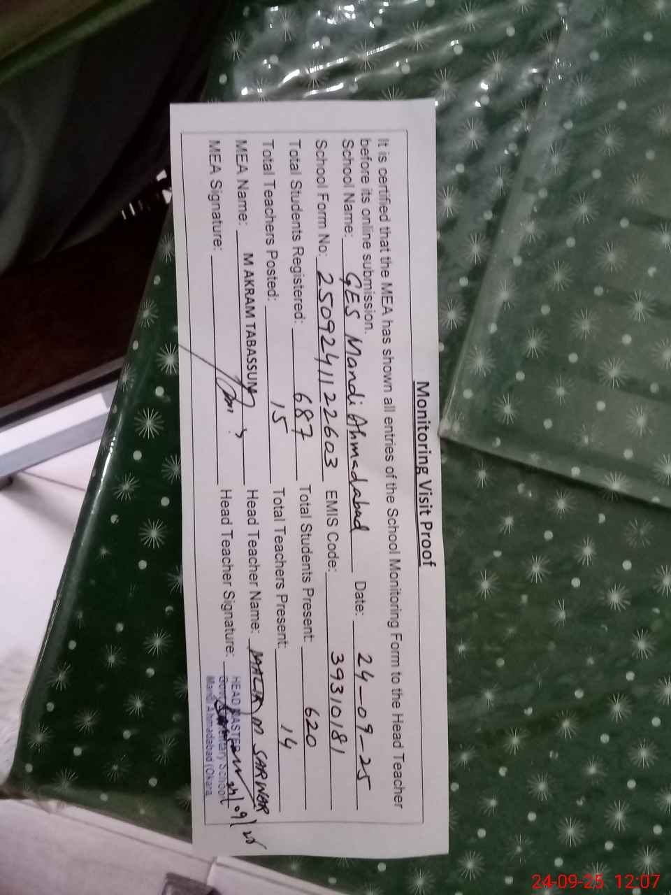 | Attendance Register | Head Teacher | MEA with School | Visit Proof |