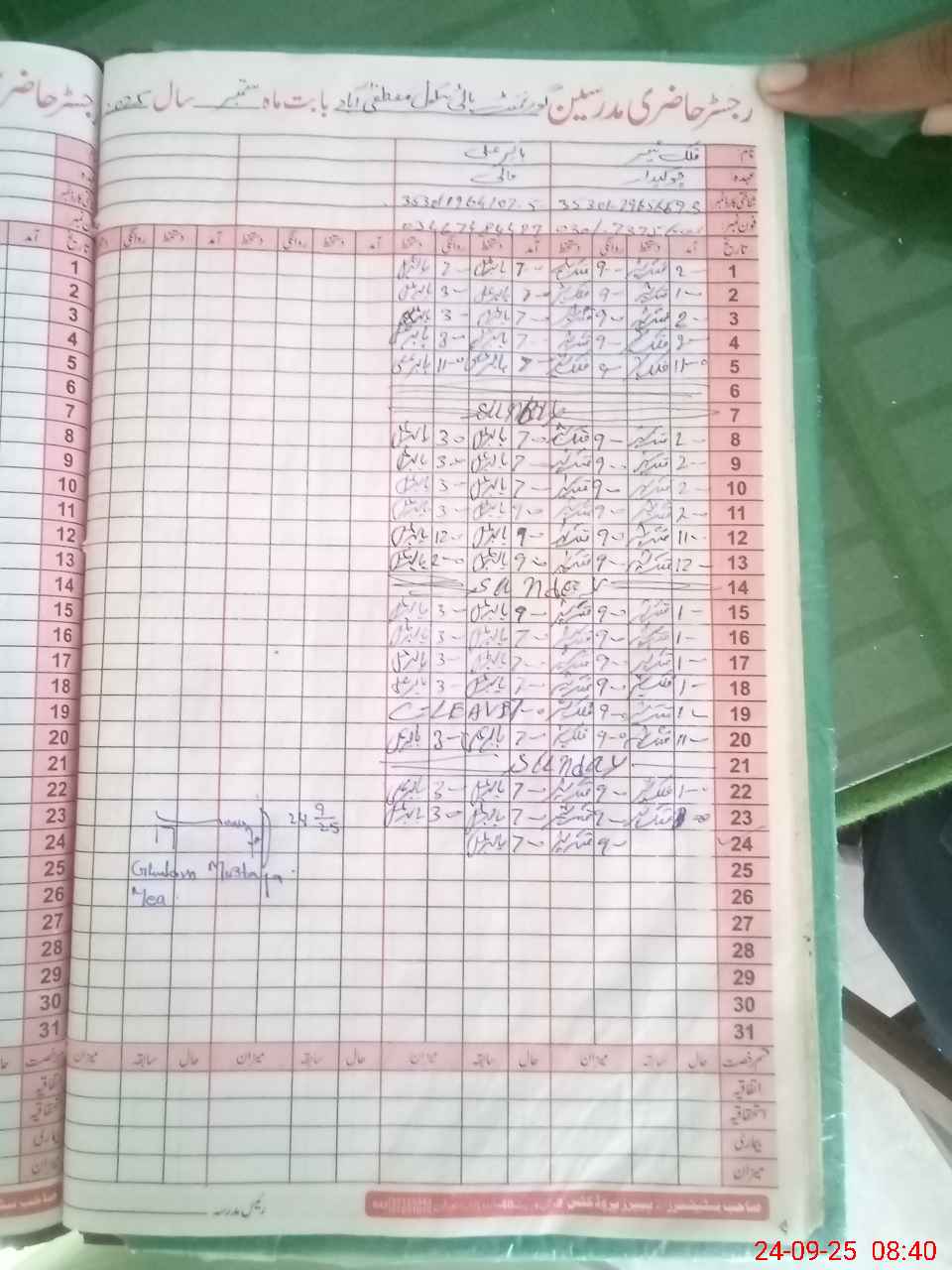 | Total no. of Classrooms: 15 No. of Classrooms Used for Teaching: 10 No. of Classrooms Storing Old Furniture, FTBs, etc: 0Comments if Any: Nominal roll for online attendance found contrary to current available students records Head teacher told that all enrolled students provided with free text books accordingly |