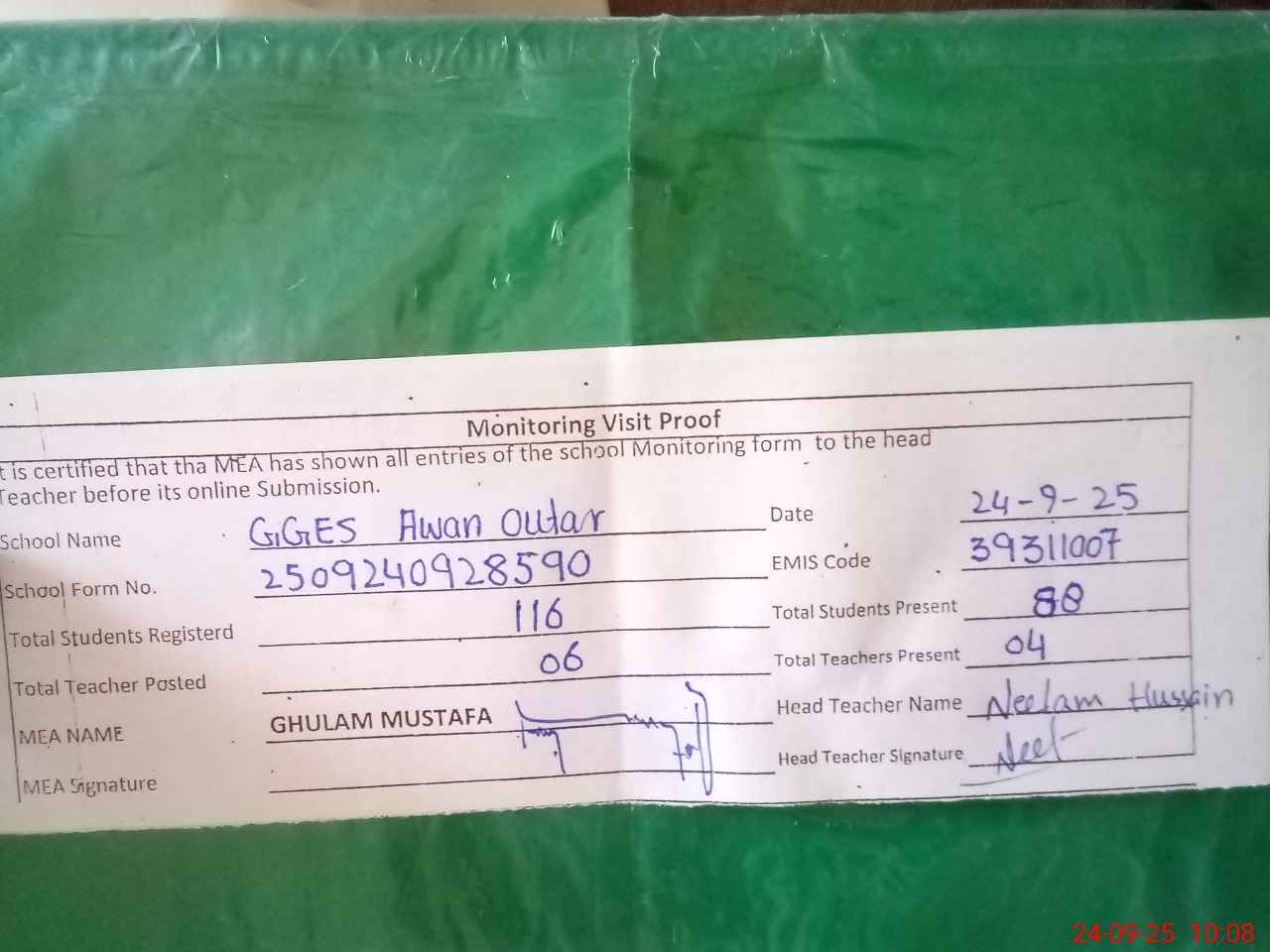 | Attendance Register | Head Teacher | MEA with School | Visit Proof |