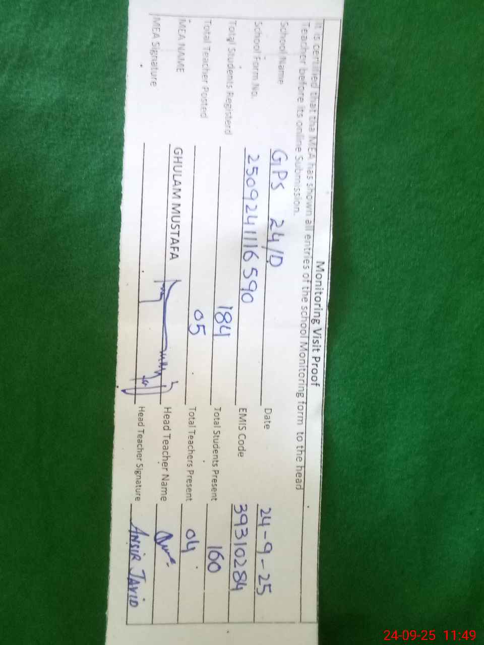 | Certified that this School was Inspected by the Undersigned MEA/DMO Today and the Information Stated Above is as Per Record. | |||||