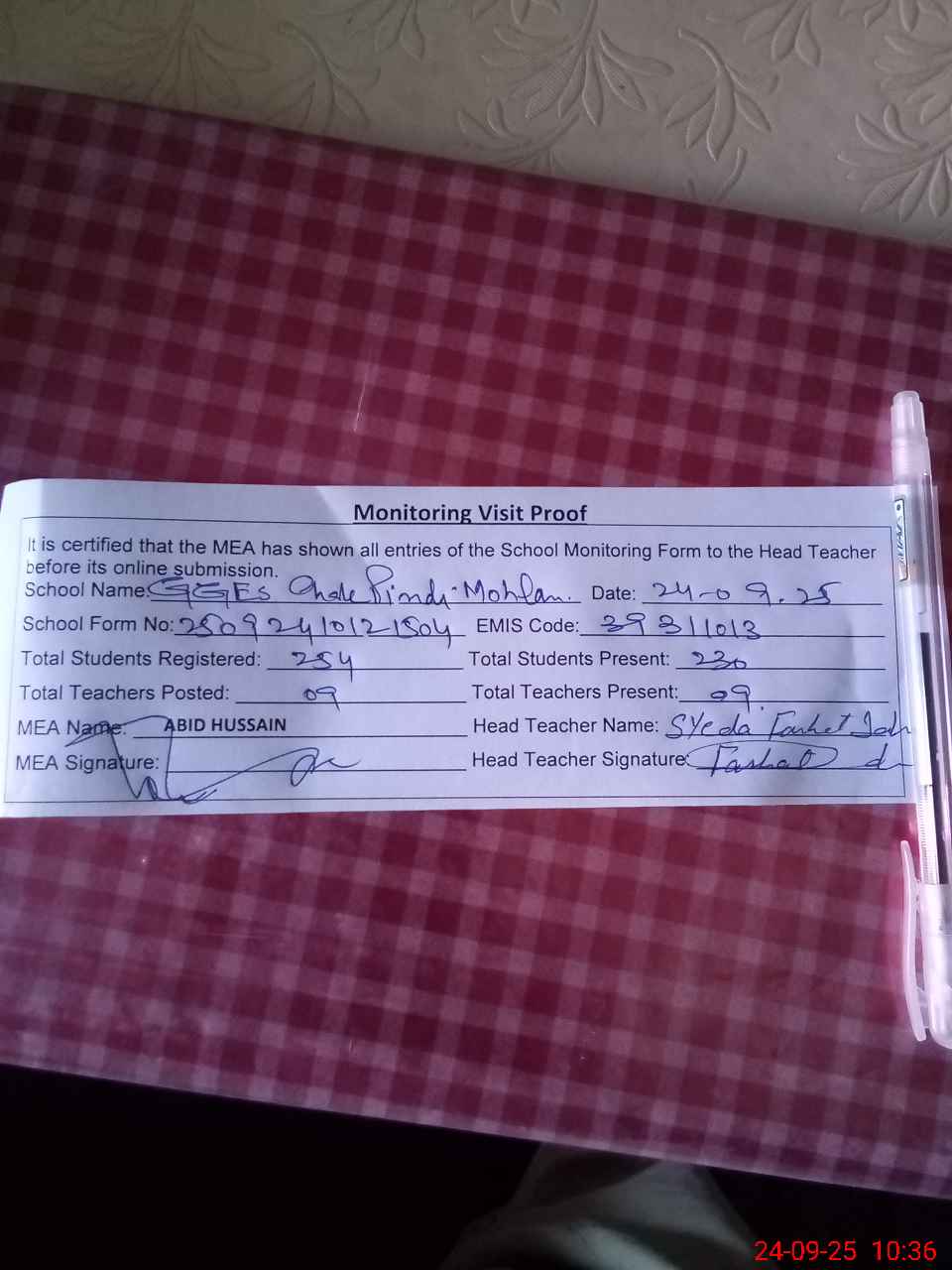 | EMIS Code: 39311013 | Name of School: GGES CHAK PINDI MOHLAN | |||