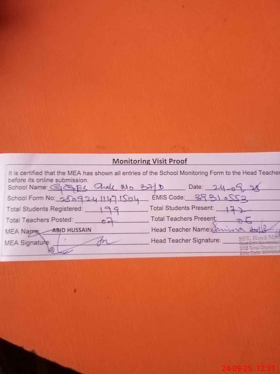 | Attendance Register | Head Teacher | MEA with School | Visit Proof |