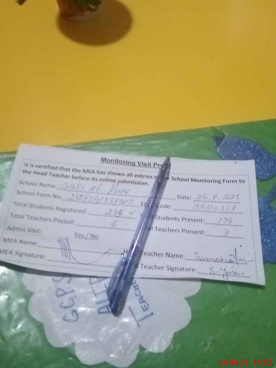 | Name: SU**** YA**** Designation: (School Headmaster's/Headmistress's) PST Phone/Cell Number: 03**** |