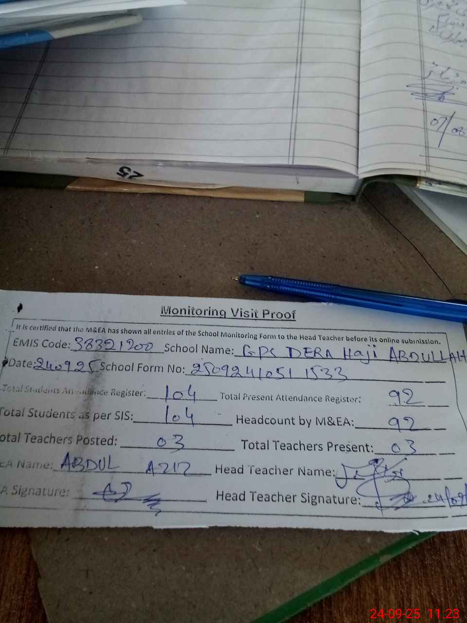 | Attendance Register | Head Teacher | MEA with School | Visit Proof |