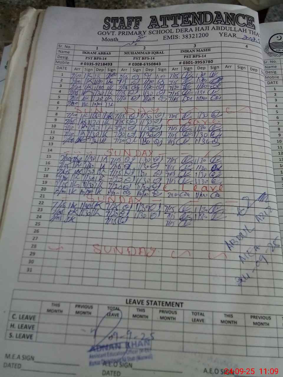 | CNIC | Full Name | Designation | R/C | Absence during last cal. month |