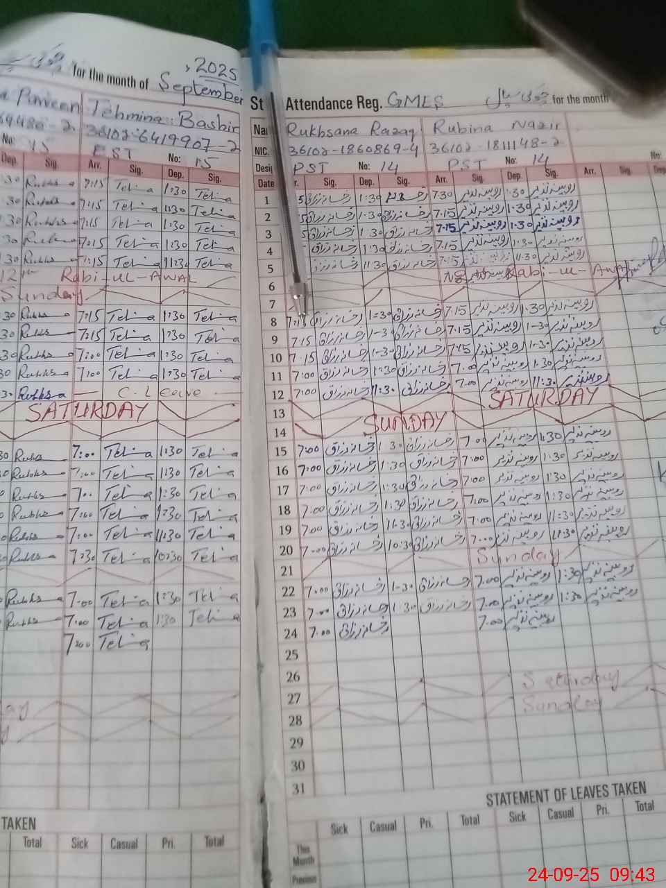 | CNIC | Full Name | Designation | R/C | Absence During Last Calender Month |