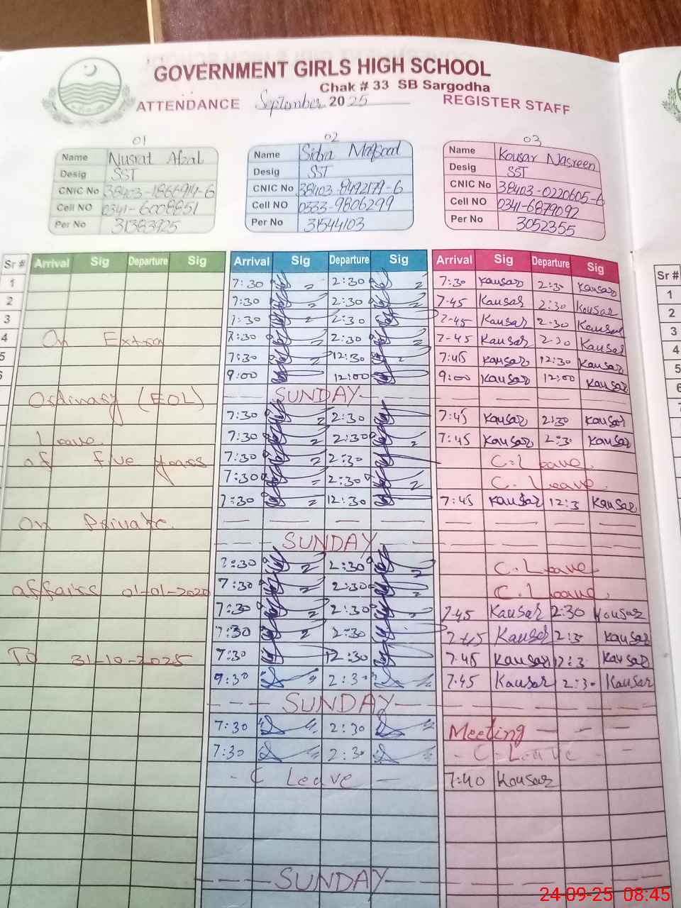 | CNIC | Full Name | Designation | R/C | Absence during last cal. month |