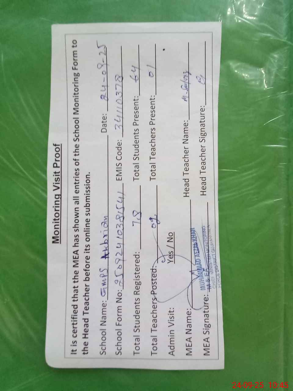 | Attendance Register | Head Teacher | MEA with School | Visit Proof |