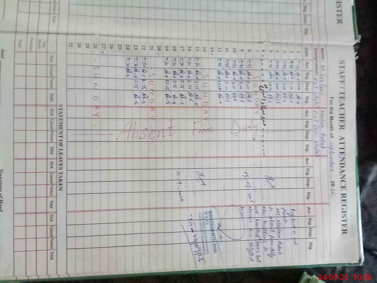 | Leave | Duty | Absent | Maternity | Medical | Ex- Pak |