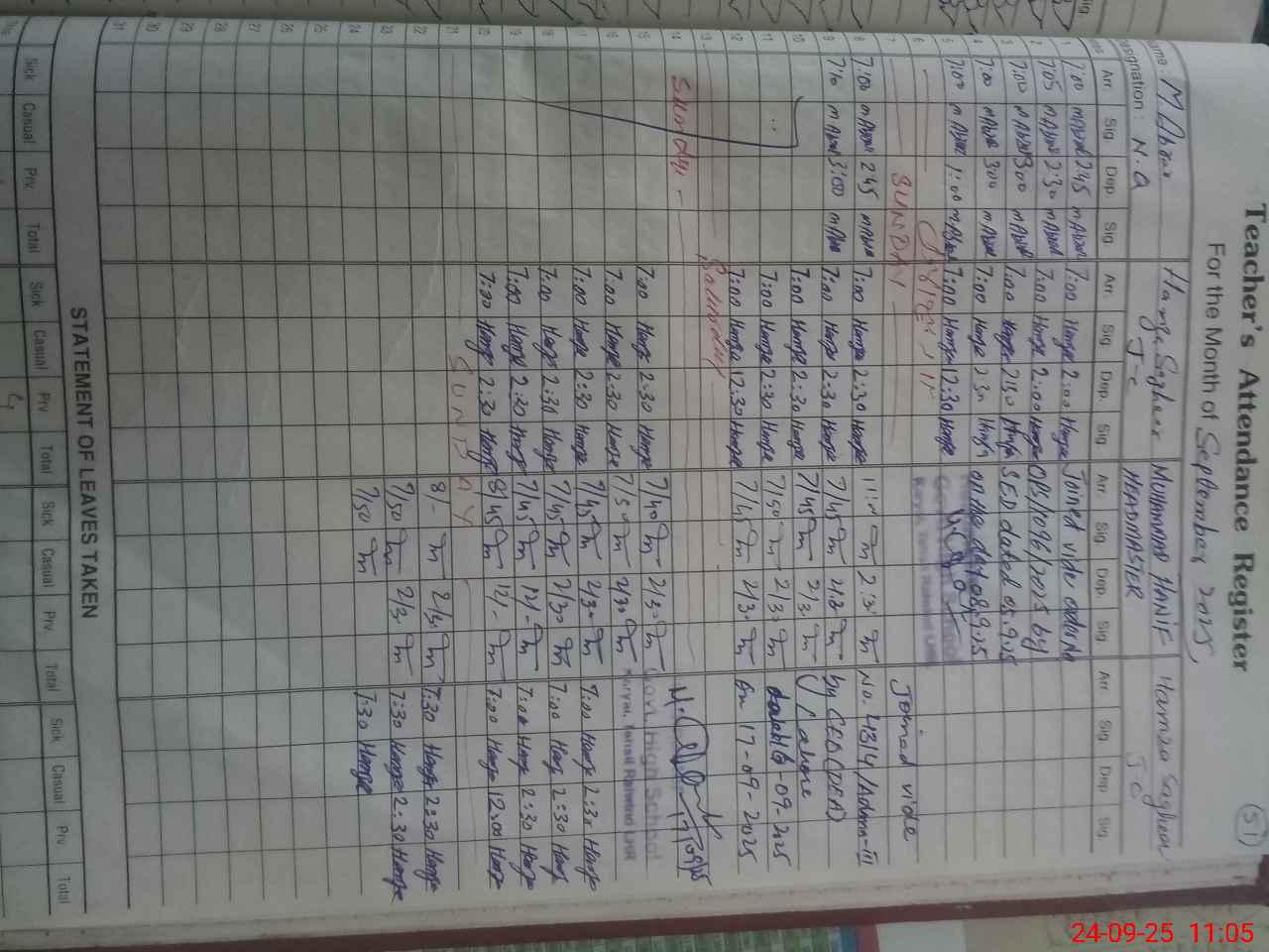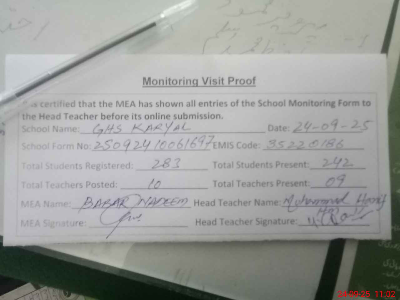 | Attendance Register | Head Teacher | MEA with School | Visit Proof |