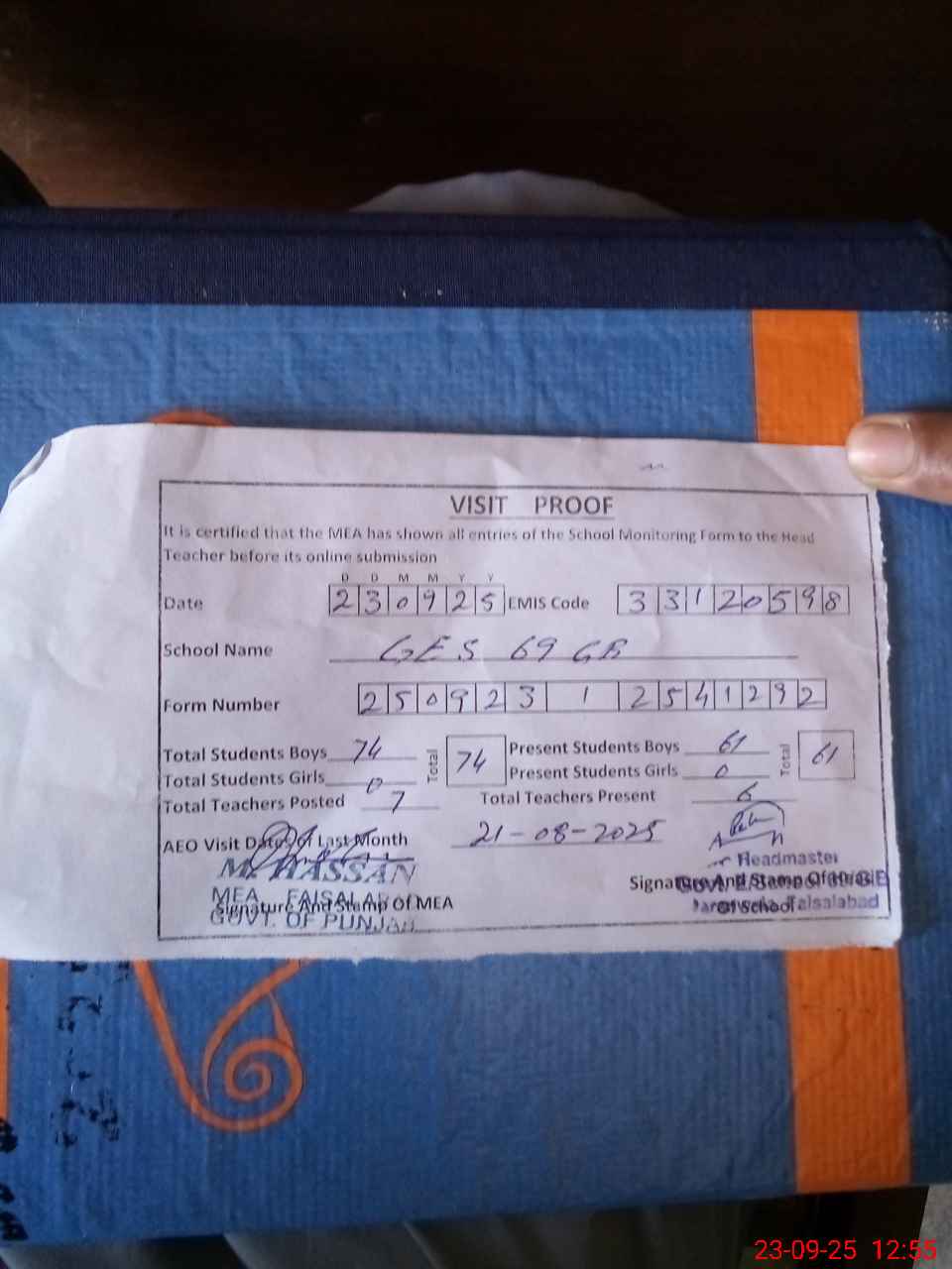 | EMIS Code: 33120598 | Name of School: GES CHAK 69 GB | |||