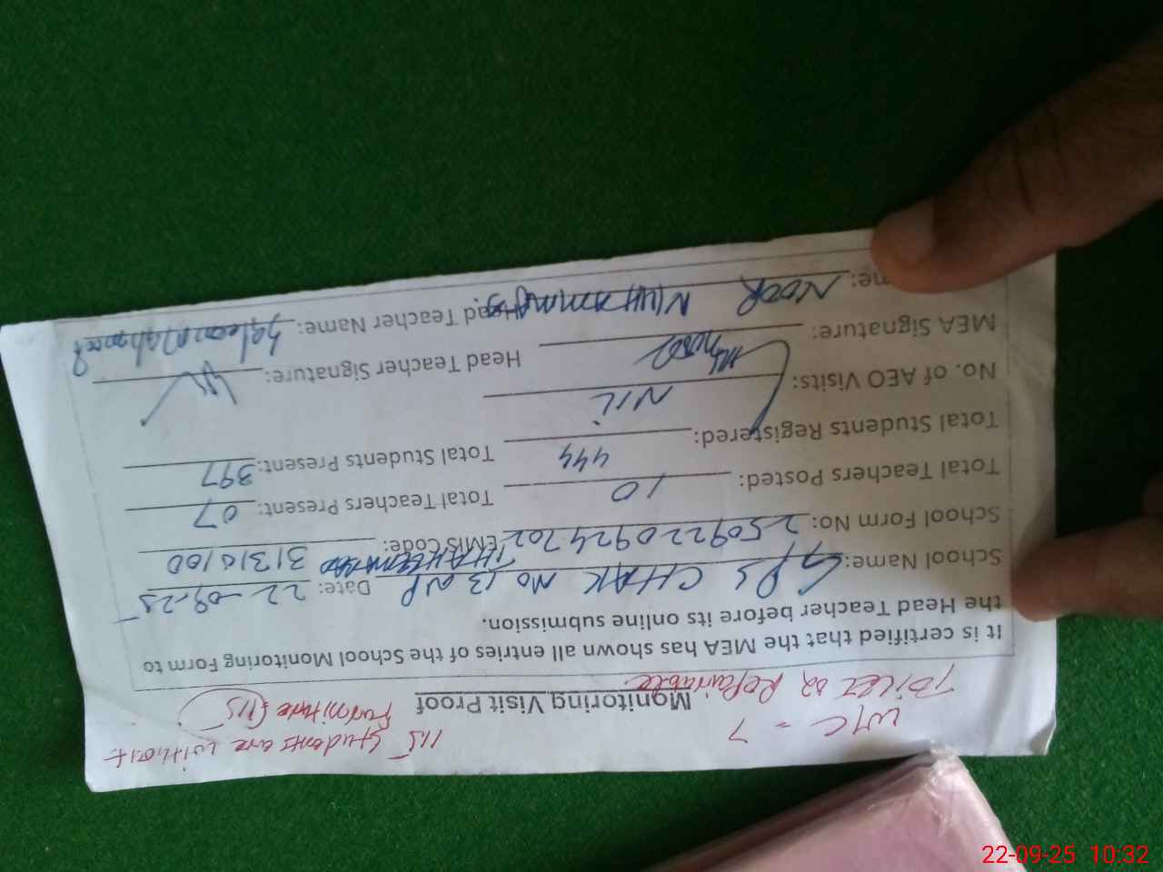 | Attendance Register | Head Teacher | MEA with School | Visit Proof |