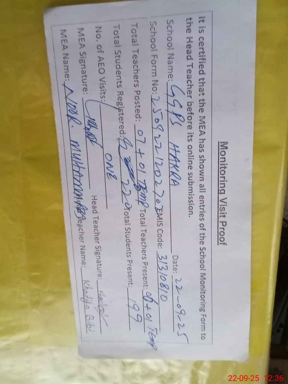 | Attendance Register | Head Teacher | MEA with School | Visit Proof |
