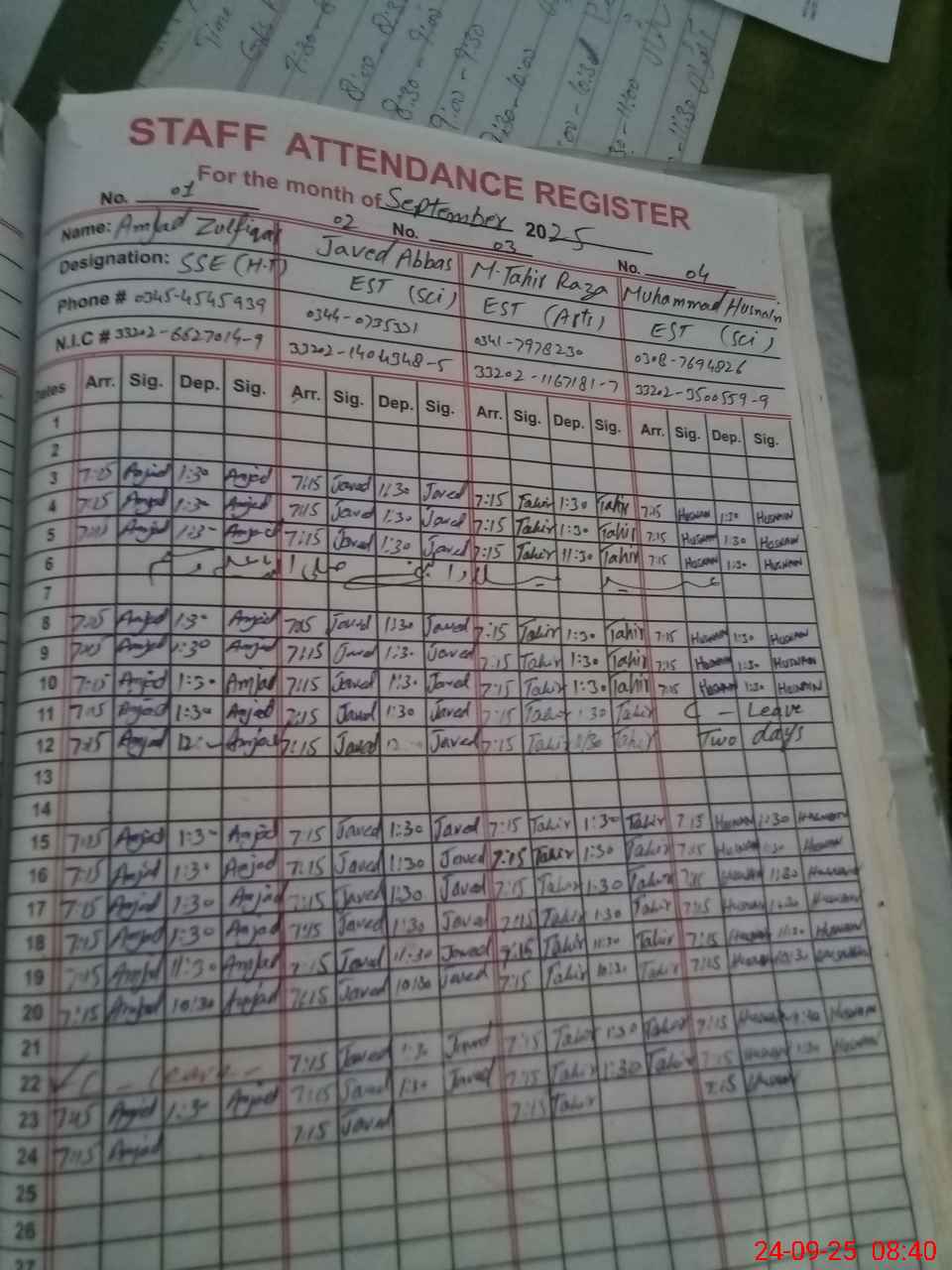 | CNIC | Full Name | Designation | R/C | Absence during last cal. month |