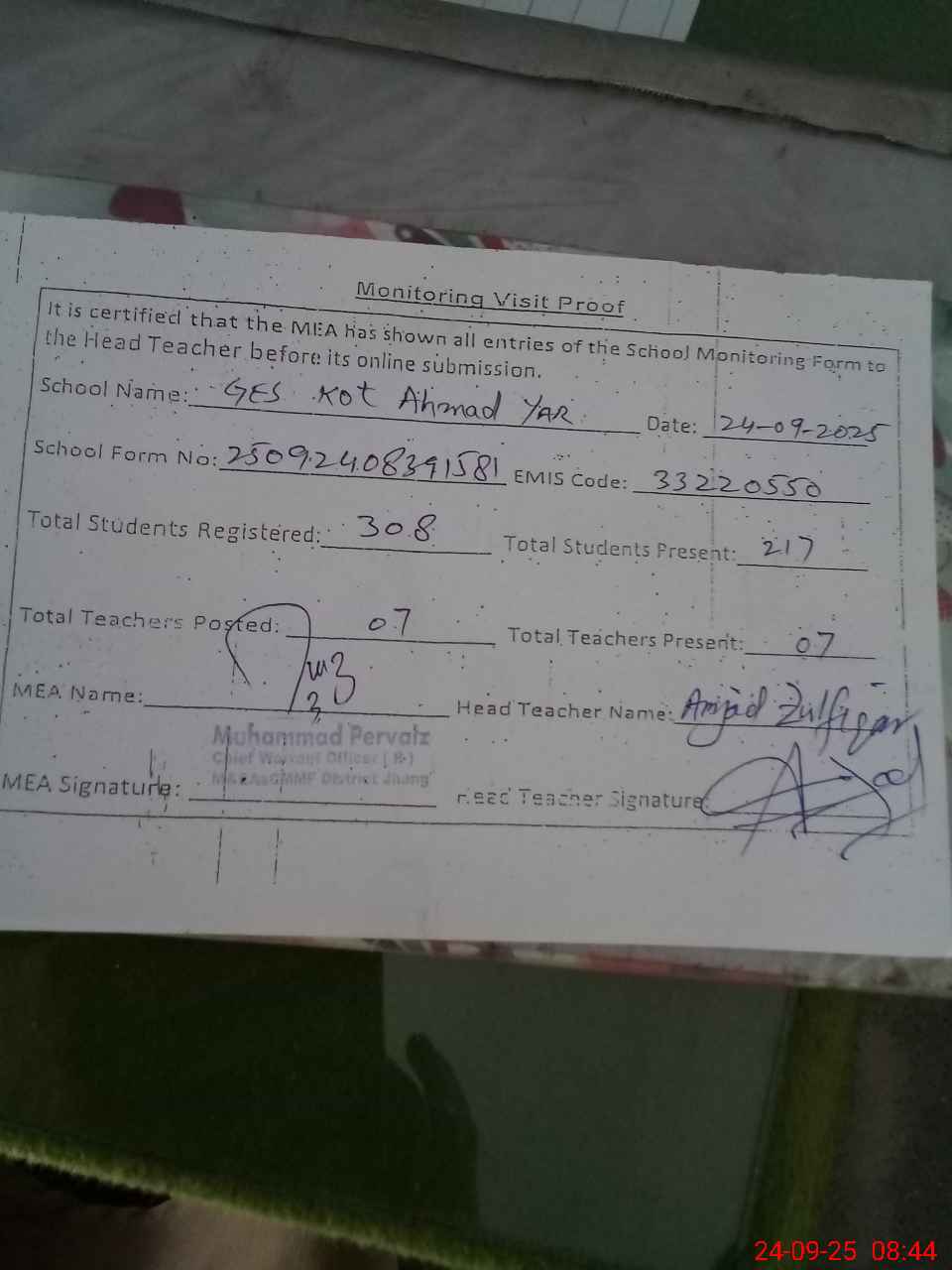 | Certified that this School was Inspected by the Undersigned MEA/DMO Today and the Information Stated Above is as Per Record. | |||||