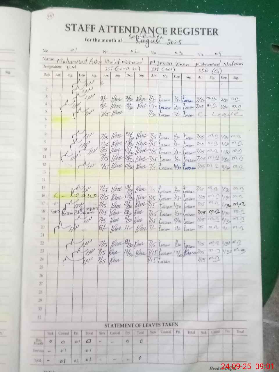 | 33**** | Mu**** Sa**** | 3 | 1 | 0 | 0 | 0 | 0 | 0 | 0 | 0 | 0 | 0 | Absent (Un-Authorized) |