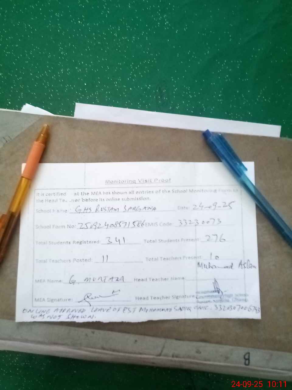 | Attendance Register | Head Teacher | MEA with School | Visit Proof |