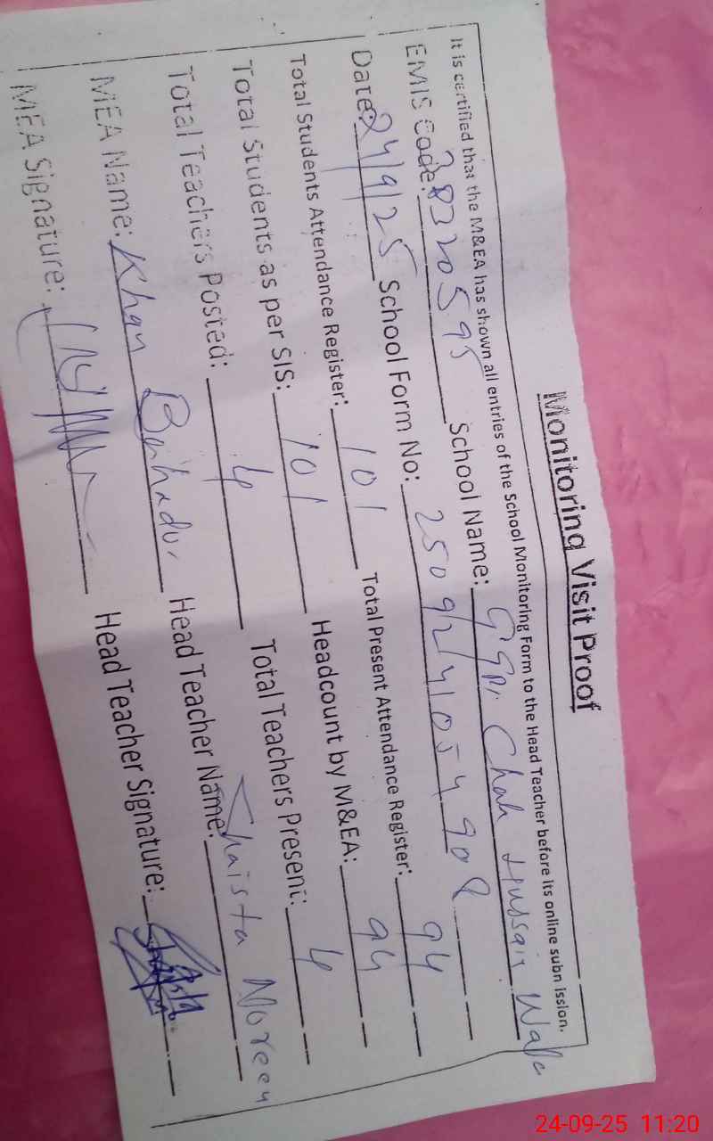 | Attendance Register | Head Teacher | MEA with School | Visit Proof |