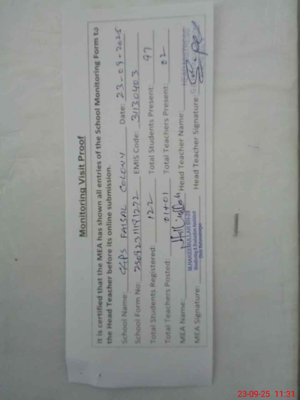 | EMIS Code: 31130403 | Name of School: GGPS FAISAL COLONY | |||