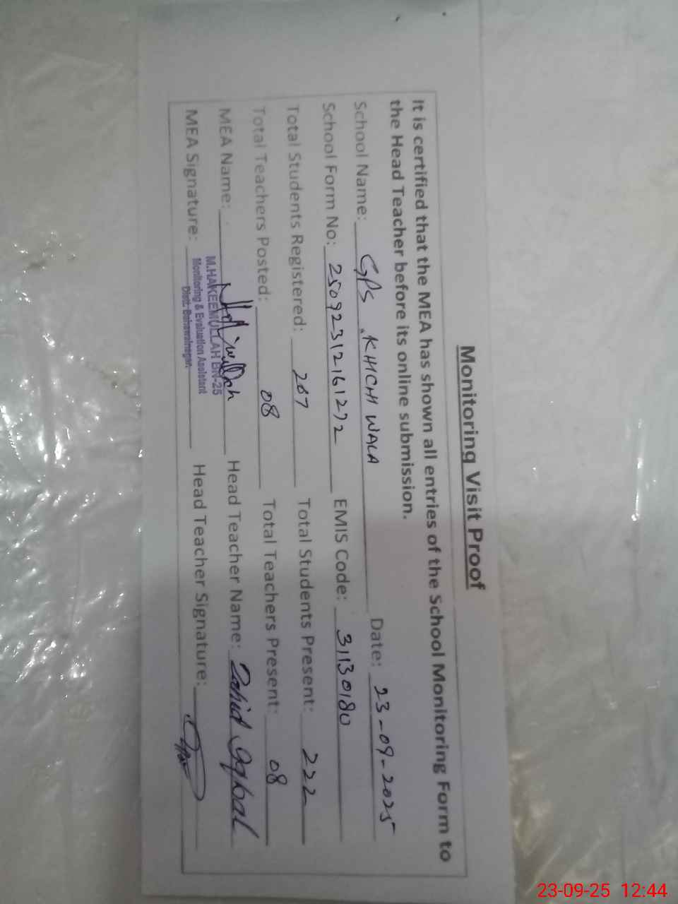 | Attendance Register | Head Teacher | MEA with School | Visit Proof |