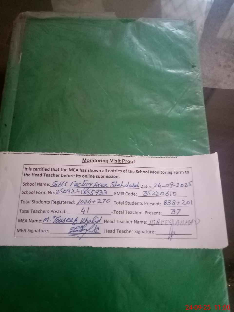 | EMIS Code: 35220610 | Name of School: GHS FACTORY AREA SHAHDARA (EX-MCL) | |||