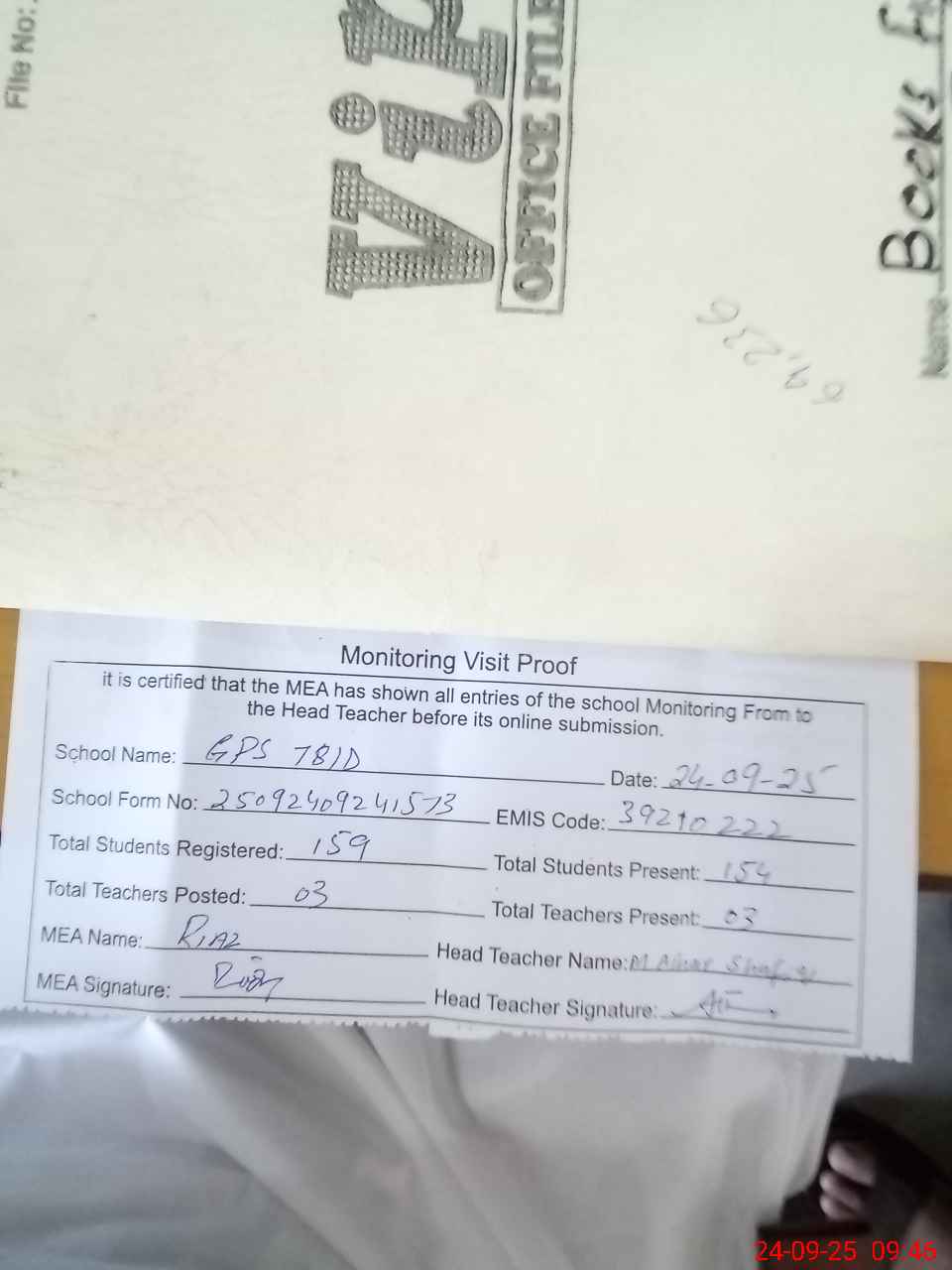 | Attendance Register | Head Teacher | MEA with School | Visit Proof |
