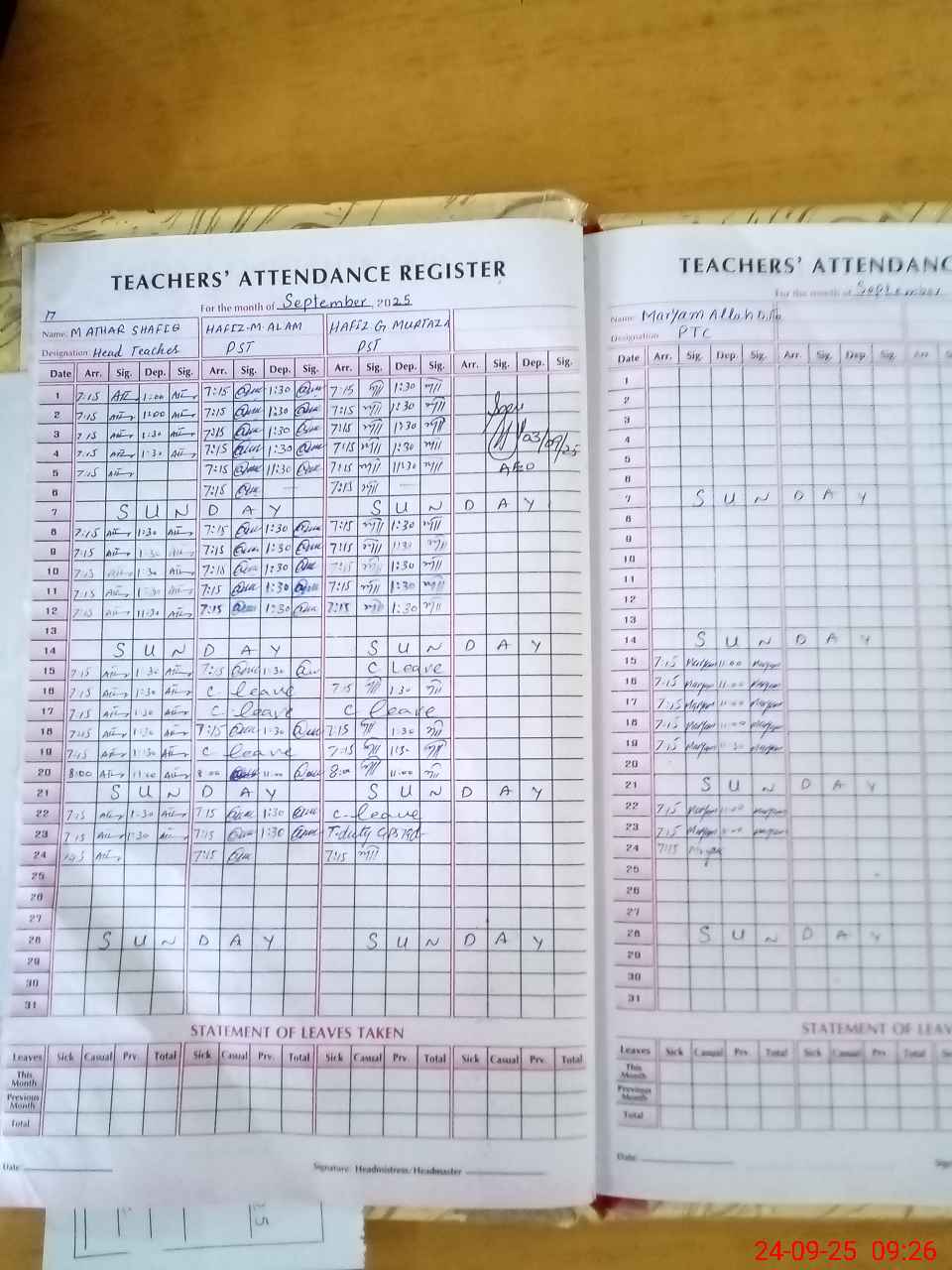 | Leave | Duty | Absent | Maternity | Medical | Ex- Pak |