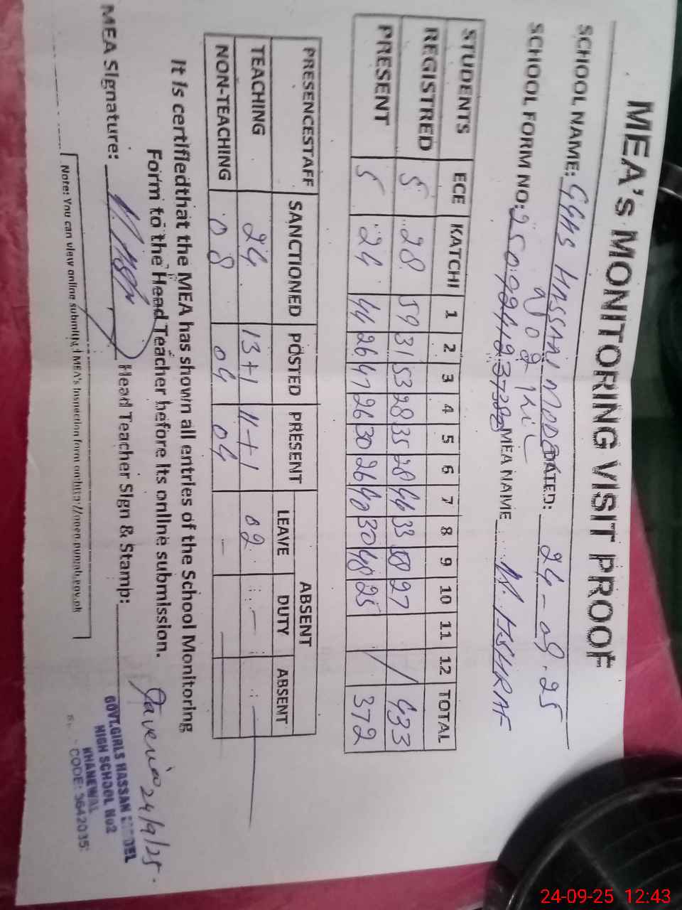 | Attendance Register | Head Teacher | MEA with School | Visit Proof |