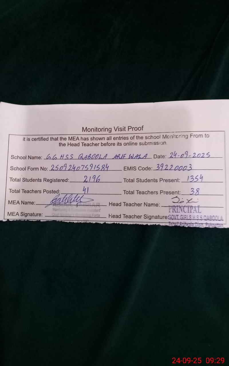 | EMIS Code: 39220003 | Name of School: GGHSS QABOOLA, ARIFWALA | |||