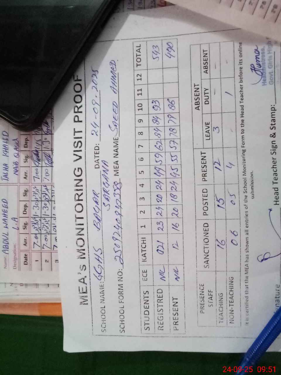 | Attendance Register | Head Teacher | MEA with School | Visit Proof |