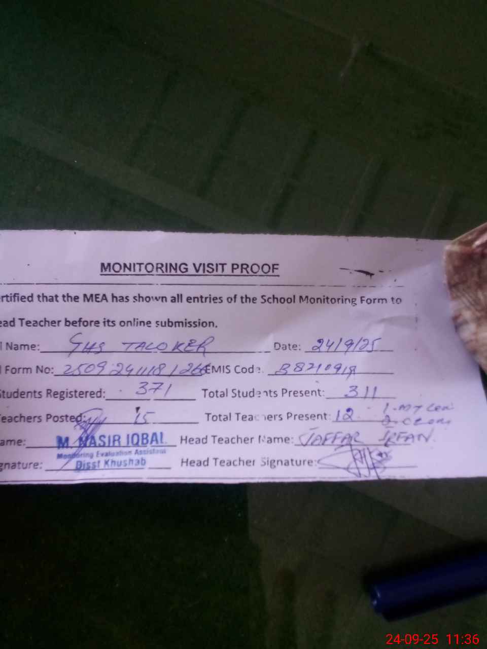 | Attendance Register | Head Teacher | MEA with School | Visit Proof |