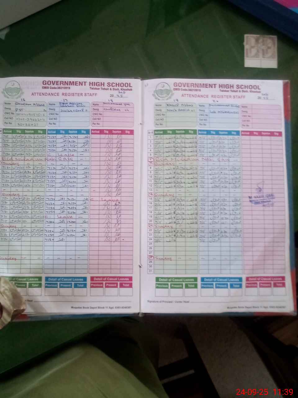 | CNIC | Full Name | Designation | R/C | Absence during last cal. month |