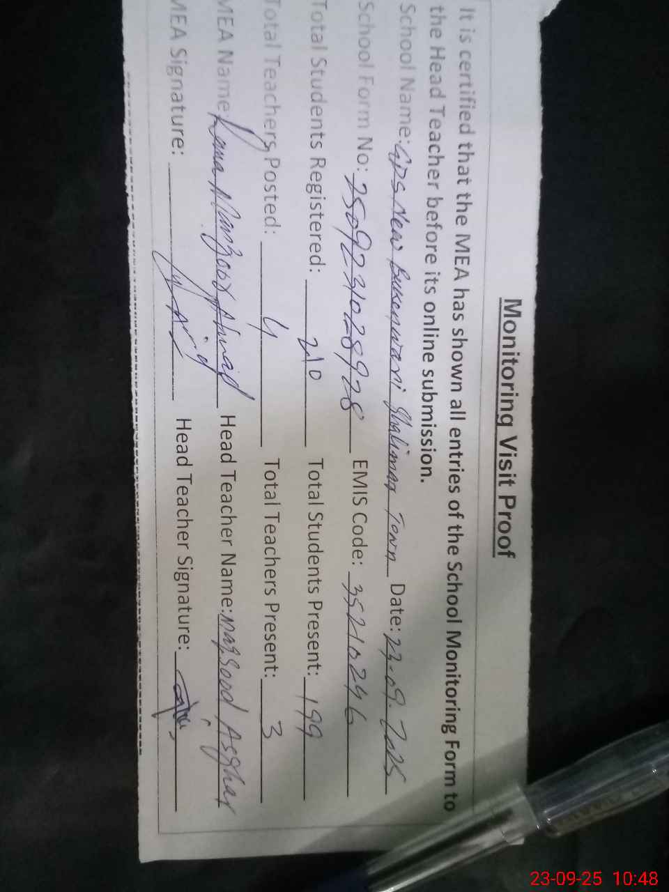 | Attendance Register | Head Teacher | MEA with School | Visit Proof |