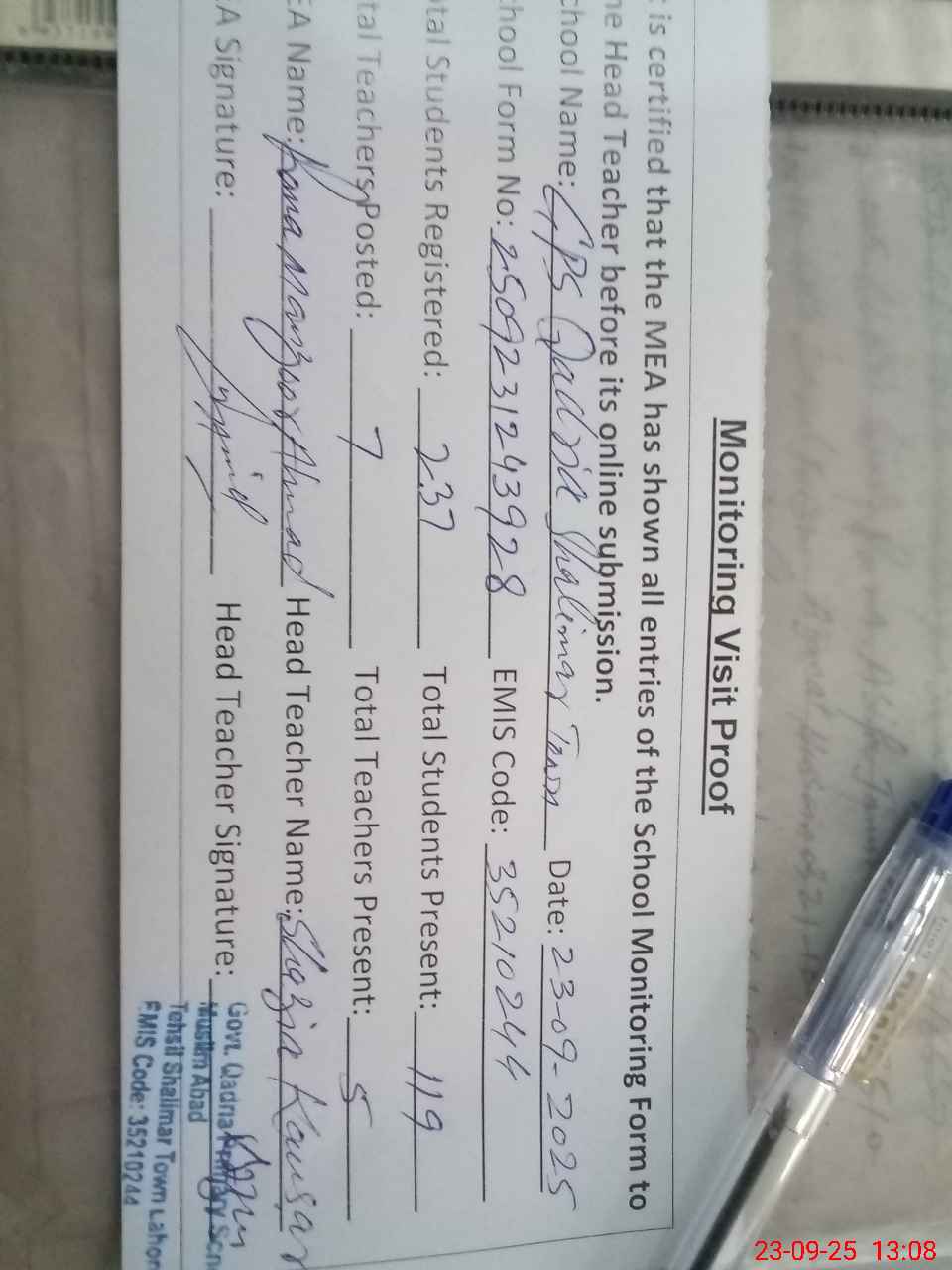 | EMIS Code: 35210244 | Name of School: GPS QADRIA SHALIMAR TOWN | |||